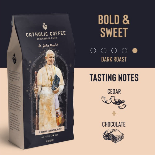 This delicious dark roast coffee honors the great saint, Pope John Paul II. He was born near Cracow, Poland and later entered seminary during WWII, when religious practice in Poland was forbidden by the Nazis. In 1978, after a rapid rise from priest to Bishop to Cardinal, he became Pope, reigning 27 years.